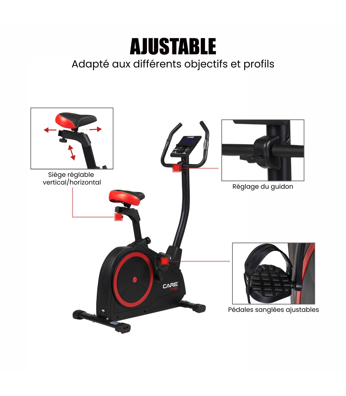 - Réglage de la selle vertical, horizontal pour adopter la meilleure posture