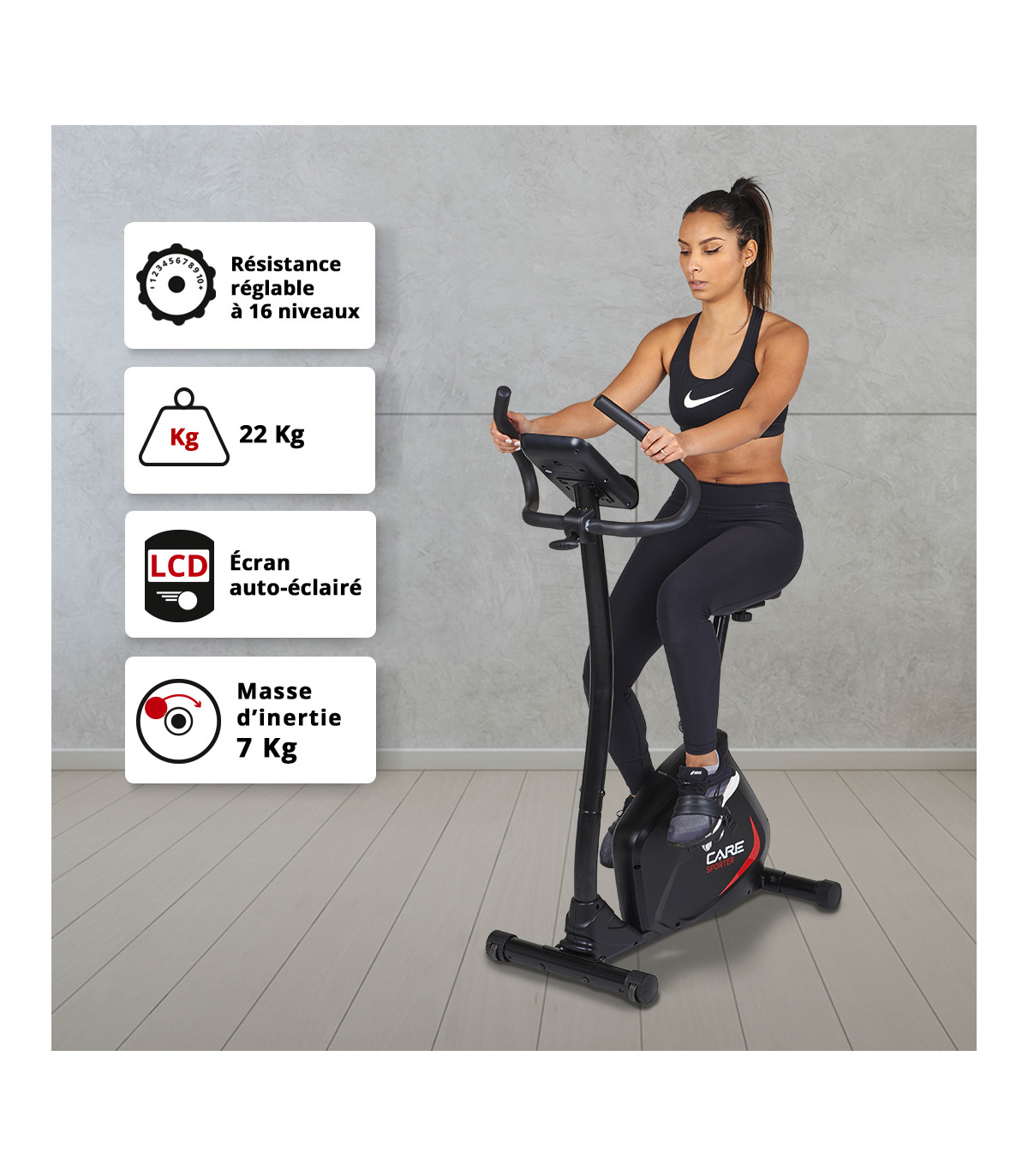 Zeer complete hometrainer uitgerust met een magnetisch weerstandssysteem met 16 niveaus, tactile hartslagsensoren Handpulse en 21 programma's geïntegreerd in de LCD-teller