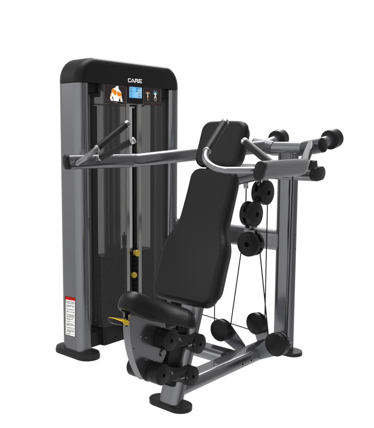 Het werk op deze pers richt zich specifiek op de hypertrofie van de deltaspieren en de versterking van de triceps en de trapezius. De vaste baan reproduceert de natuurlijke verticale duwbeweging, wat de spiercontractie aan het einde van de beweging maximaliseert terwijl de schoudergewrichten worden beschermd. De zittende oefening elimineert spiercompensaties door schommelingen van de romp, waardoor een strikte activering van de vezels van de brachiale deltaspier wordt afgedwongen. De geleide belasting beveiligt de training tot spierfalen zonder dat een trainingspartner nodig is, waardoor intensieve krachtcycli mogelijk zijn. Het gebruik van verschillende grepen, neutraal of in pronatie, maakt het mogelijk om specifiek de anterieure brachialis of de stabilisatoren van de rotatormanchet aan te spreken. De nauwkeurige aanpassing van de weerstand in stappen van 6 kg of halve belasting maakt het mogelijk de inspanning af te stemmen op de doelstellingen van kracht of spieruithoudingsvermogen.