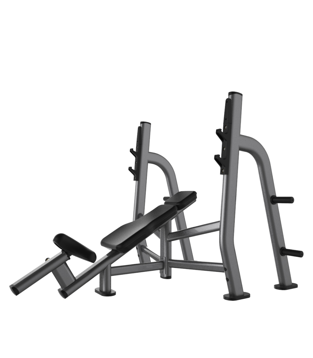 Dit schuine olympische bankje wordt gekenmerkt door een robuuste structuur die is ontworpen om zware lasten te dragen tijdens intensief werk aan de borstspieren. Met een gewicht van 75 kg op de weegschaal zorgt dit chassis van versterkt staal voor onwrikbare stabiliteit bij atletische krachtoefeningen. De ruime afmetingen van 201 cm x 161 cm x 141 cm hoogte bieden een veilig werkplatform voor een volledige bewegingsamplitude. De vaste helling van de rugleuning maakt een nauwkeurige targeting van de bovenste bundel van de grote borstspier mogelijk, terwijl ook de voorste deltaspieren worden aangesproken. Het ontwerp integreert twee niveaus van stanghouders met een bescherming van hogedichtheid kunststof om de olympische stang te beschermen en de geluidsimpact bij het vergrendelen van het gewricht aan het einde van een serie te minimaliseren. Vier geïntegreerde schijfhouders voor gietijzeren schijven zijn doordacht geplaatst om gemakkelijke toegang tot de gewichten te bieden zonder de werkruimte te blokkeren.