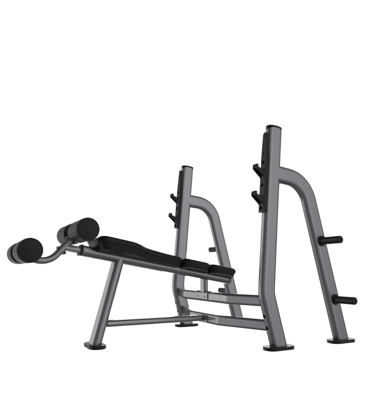 Het trainen op deze decline bank is essentieel om spieronbalansen te corrigeren en een volledige definitie van de grote borstspier te verkrijgen. Door de duwhoek te wijzigen, vermindert u de spanning op de voorste deltaspieren terwijl u de belasting op het onderste deel van de borstspieren en de triceps vergroot. De configuratie met twee niveaus van stanghouders maakt het mogelijk de stanguitgang aan te passen aan ieders lichaamsbouw, wat een explosieve concentrische fase in alle veiligheid bevordert. Dit toestel is het ideale hulpmiddel voor krachtprotocollen, waarbij het gebruik van dumbbells of zware stangen mogelijk is. De stabiliteit die wordt geboden door het vastzetten van de benen op de rollen stelt u in staat zich uitsluitend te concentreren op de contractie van de beoogde spiervezels. Het open frameontwerp vergemakkelijkt de toegang voor een trainingspartner tijdens series tot spierfalen.